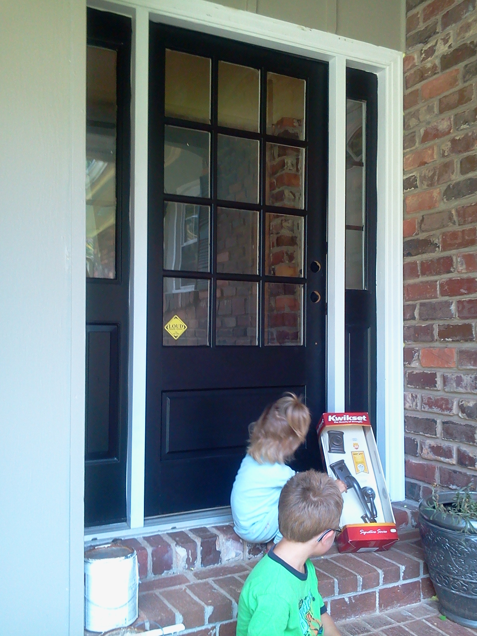The new front door up and the day our hardware shipped to us! Found off amazon for a steal! The kids were so excited about the door and walked in and out about 50 times. And I let them.