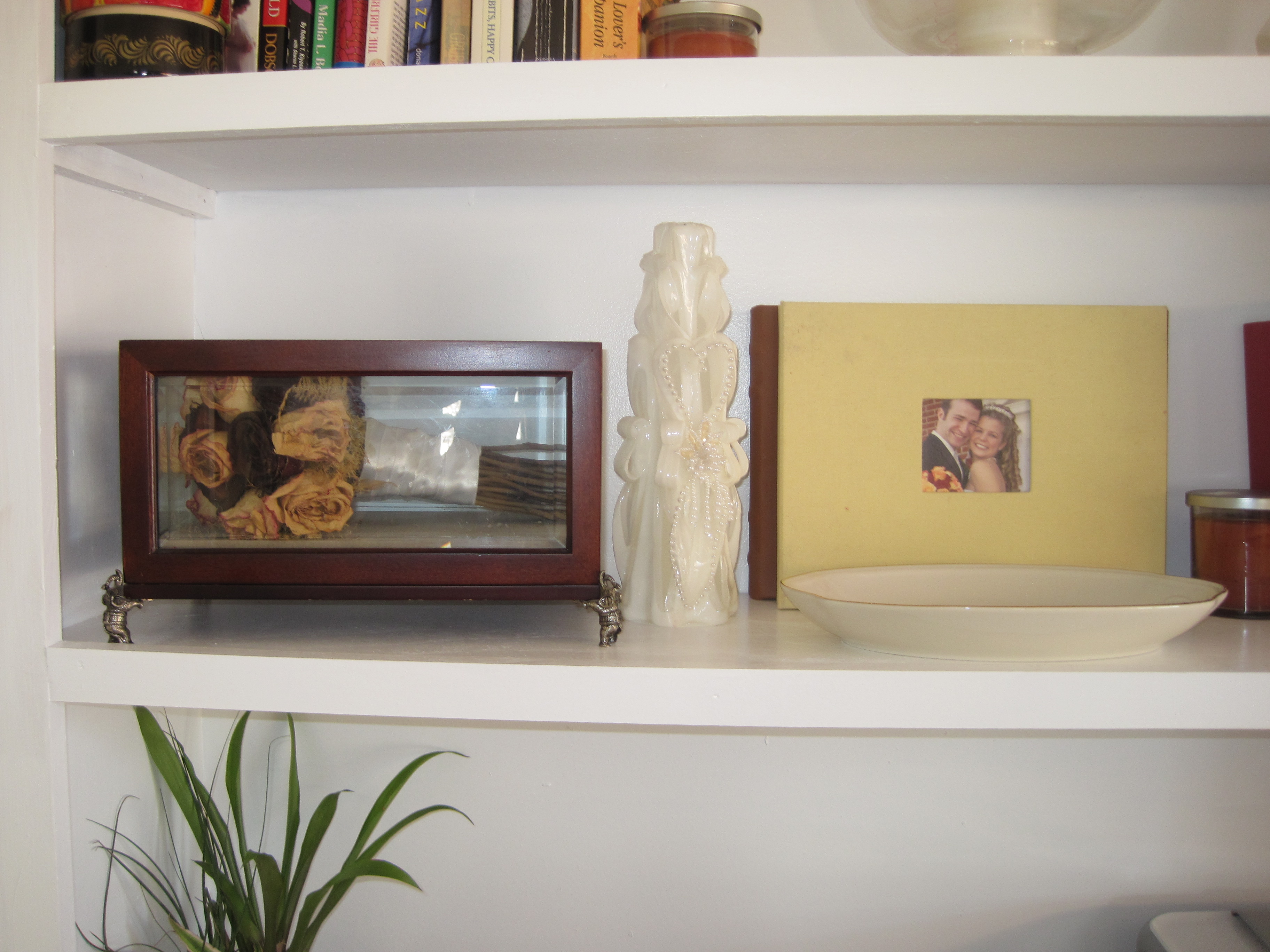 Here is our wedding bouquet, unity candle, and photo album. The other side is a family pic, basket, and my great grandmother’s tea kettle. My huge fork and spoon I found at a yard sale this summer for $1 each. They sell at Pottery Barn for $150. Other than that, this serves as our bookshelf housing all of our books. The left side is also a mini desk area with our printer and laptop!
