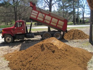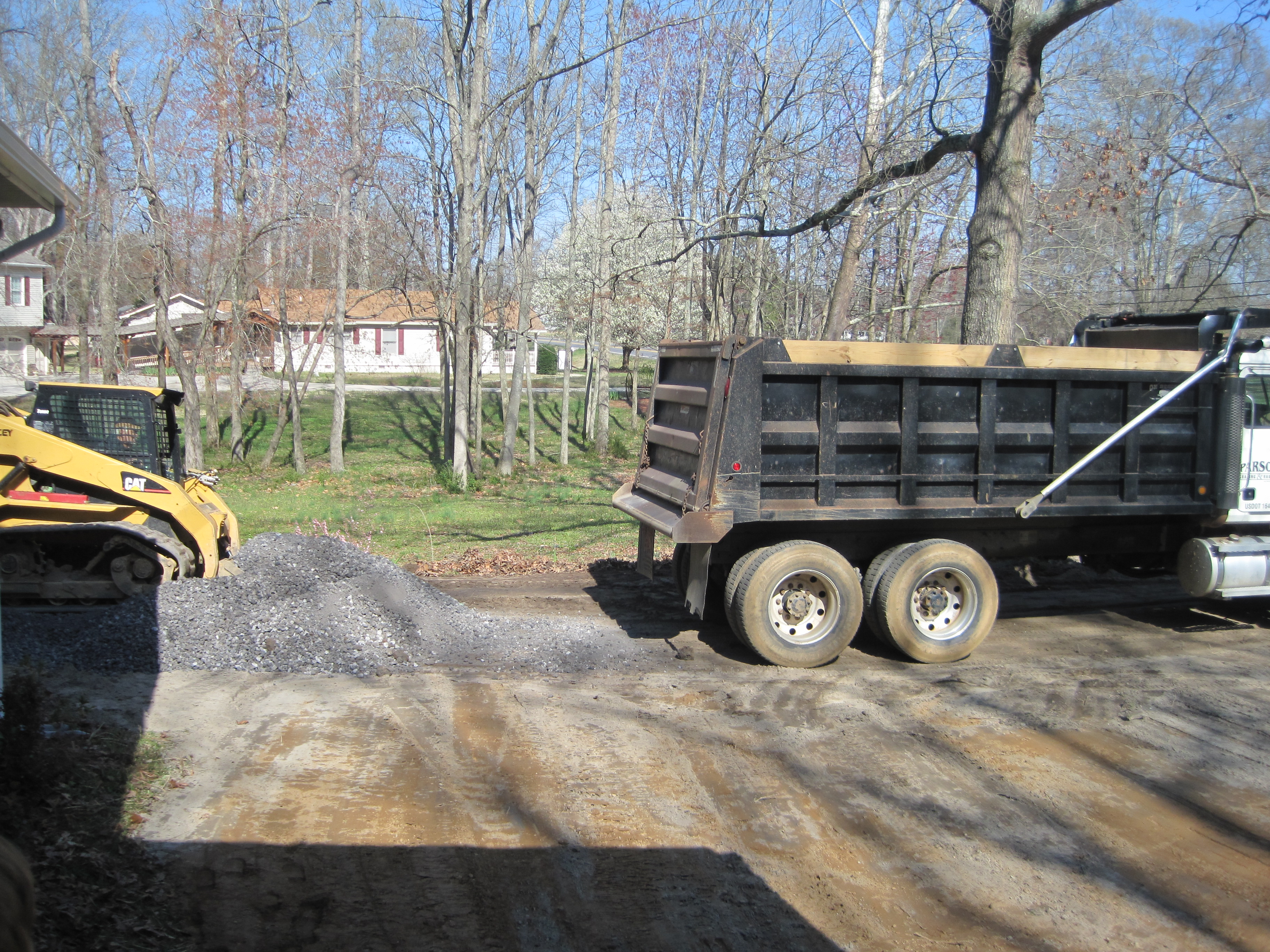 So, we called a hauling and grading company and they helped us out! We had 3 dumptruck loads of topsoil dropped and 2 dumptruck loads of slag rock poured for a driveway. A bobcat came along with them and completely re-graded our yard!