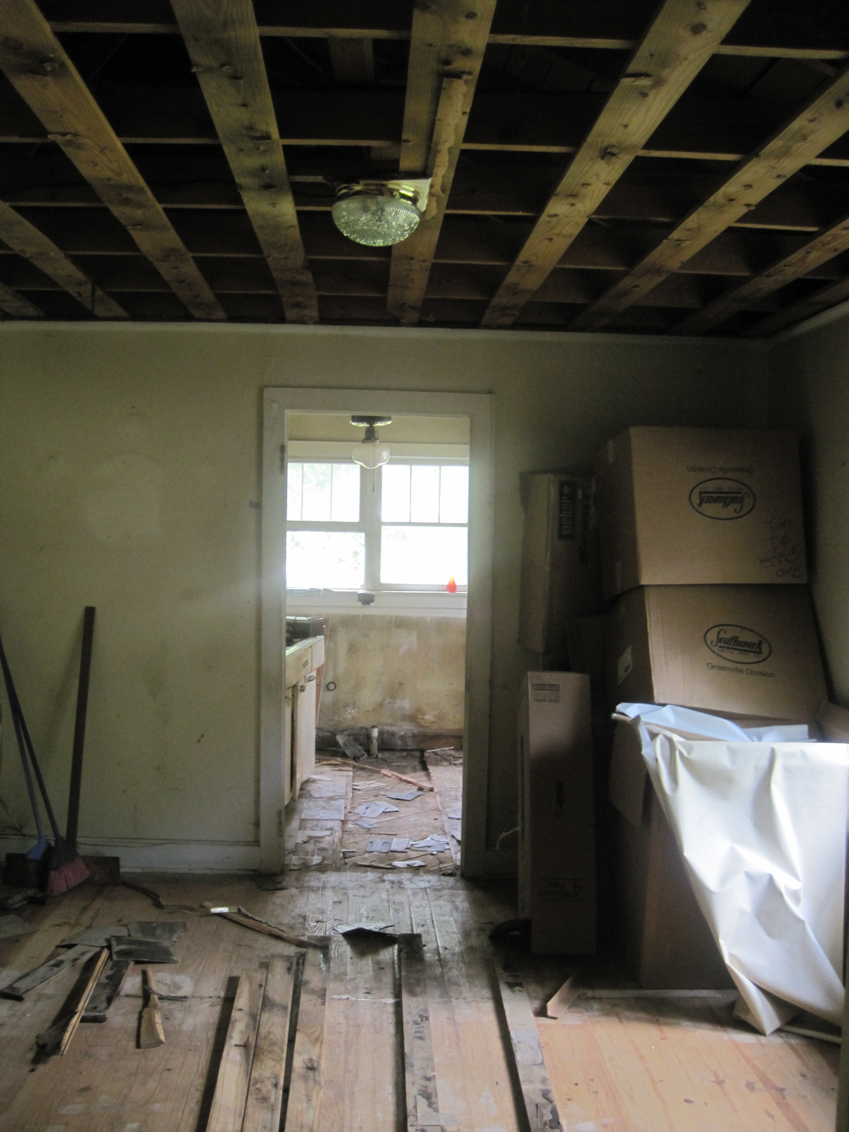 All ceilings have been ripped out to be replaced with clean, white sheetrock. All linoleum ripped out.