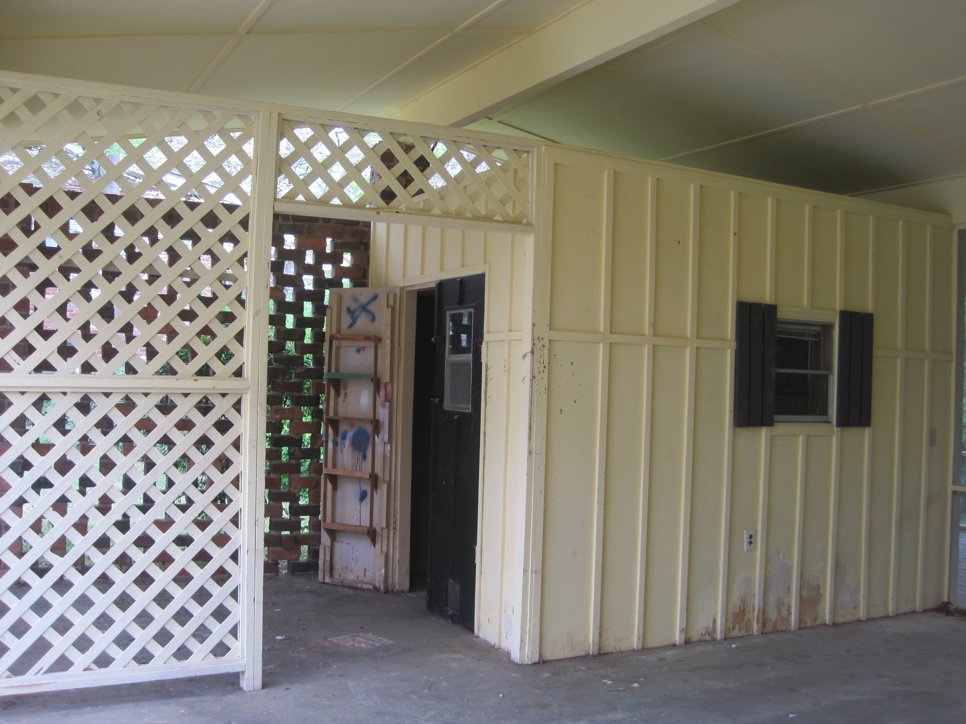 The carport with a lovely piece of lattice that is hiding, guess what? A shed. What is it with the homes we buy and sheds? And this one is creepy- beyond creepy- cant wait to post demo pics of what we found in it today.